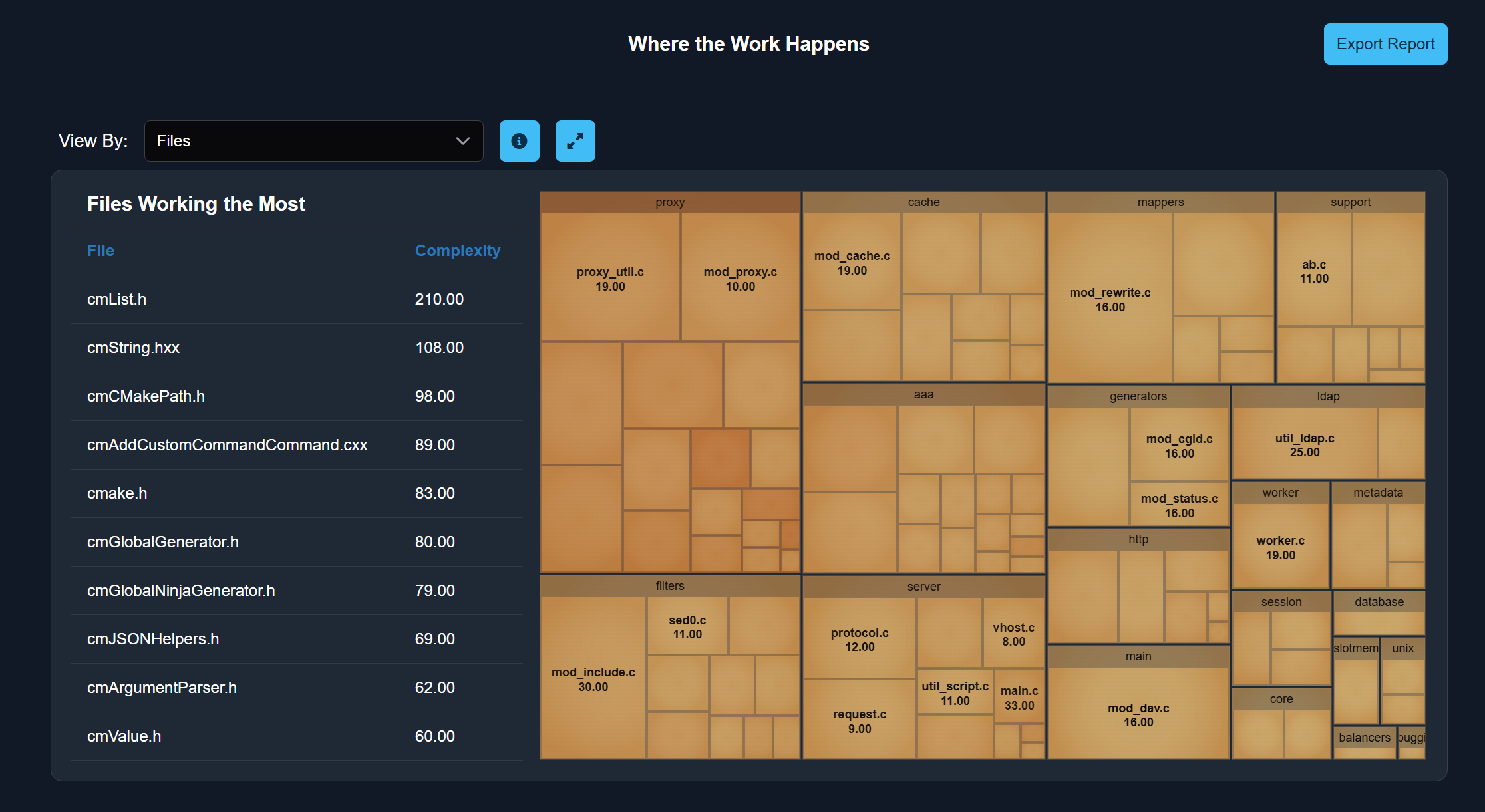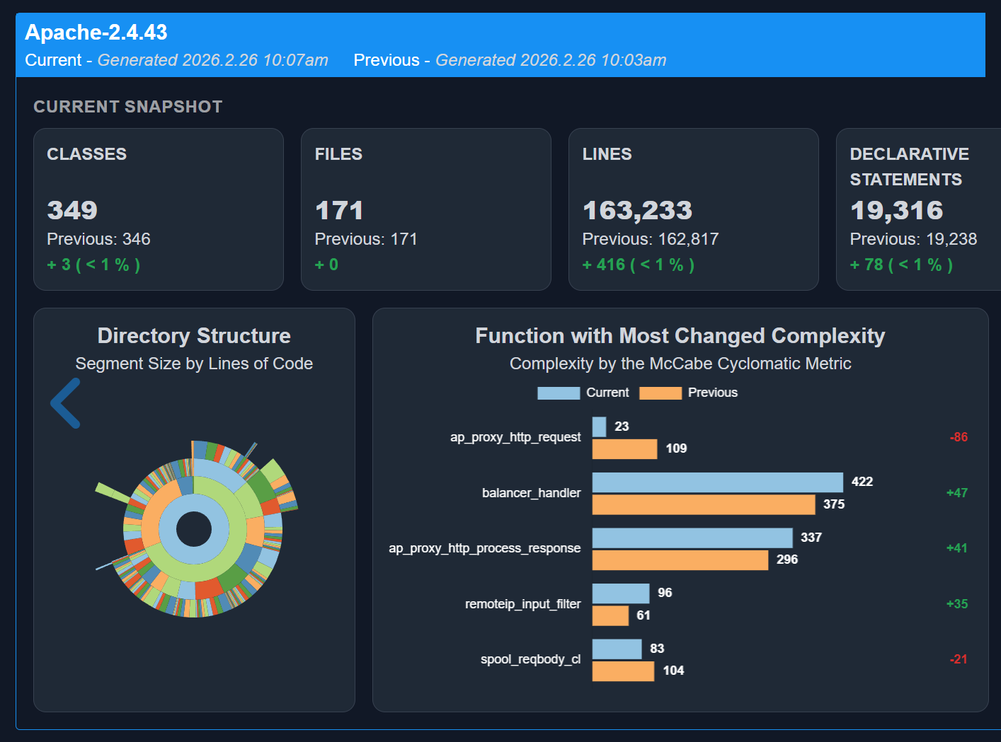 Explore a live demo using the 163k LOC Apache codebase.